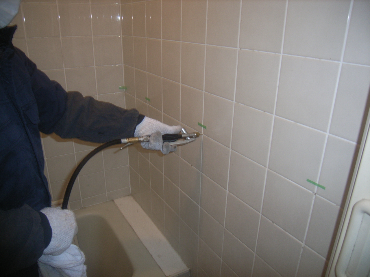 ねじ穴などはありませんのでタイルの目地に小さな穴を開けさせて頂き、薬剤を注入します。