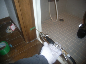 玄関のドア枠の柱やタイル張りの浴室の壁面は、床下から薬剤処理することができないことがほとんどです。