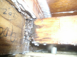 ボードをはがしてみると柱沿いに蟻道が上がっているのが分かります。